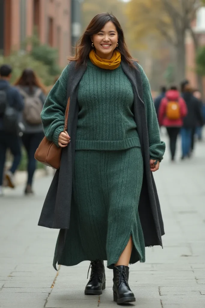 A masterclass in tonal dressing and cozy sophistication. Rich forest green envelops the silhouette from shoulders to shins, marrying ribbed texture with structured layering.