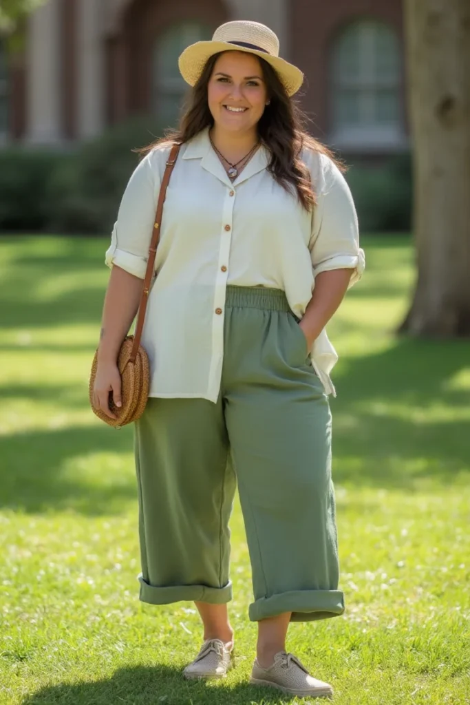 Effortless spring styling perfect for plus-size campus comfort. Cream linen shirt paired with sage wide-leg trousers creates breezy, sophisticated silhouette. Rolled sleeves and cuffs add casual touch while maintaining polished appearance for outdoor classes or campus events.
