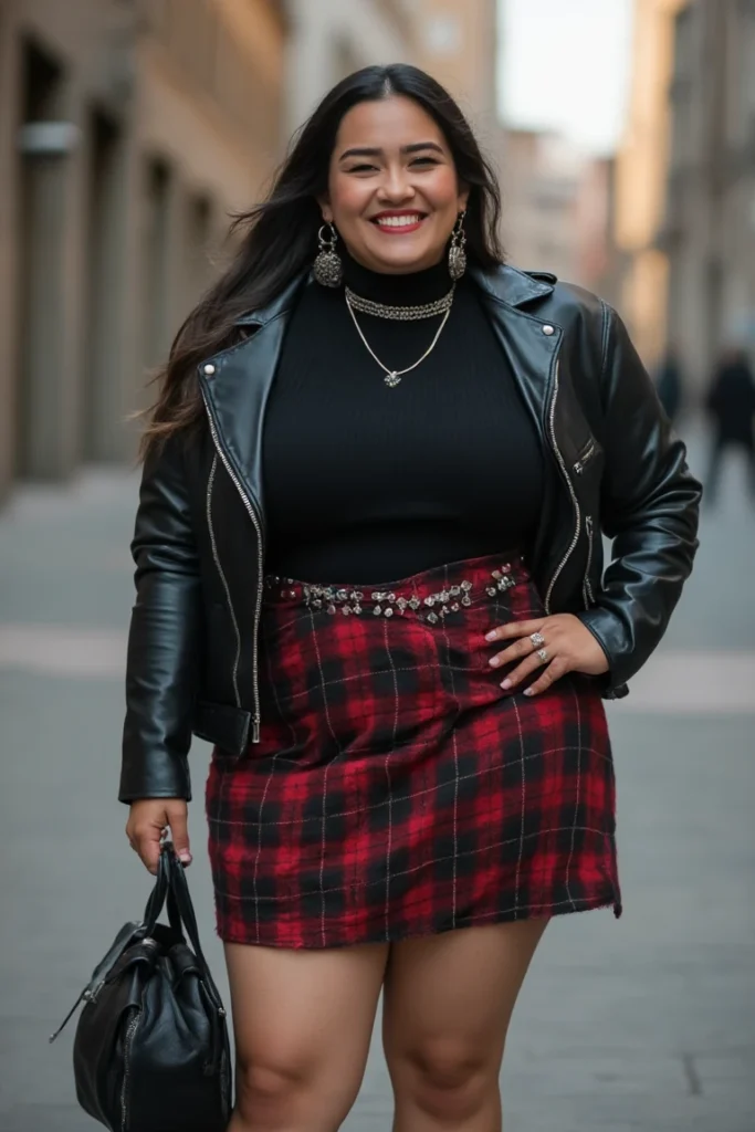 Edgy styling brings ’90s vibes to plus-size campus fashion. Black leather moto jacket paired with fitted turtleneck creates sleek foundation. Red tartan mini skirt adds punk-inspired contrast with studded belt detail for extra edge.
