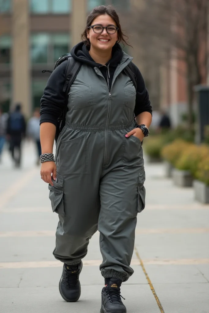 Utilitarian styling meets plus-size practicality perfectly. Olive technical jumpsuit features multiple cargo pockets and adjustable fit through elastic waistband. Black hoodie layered underneath adds warmth while maintaining streamlined silhouette.