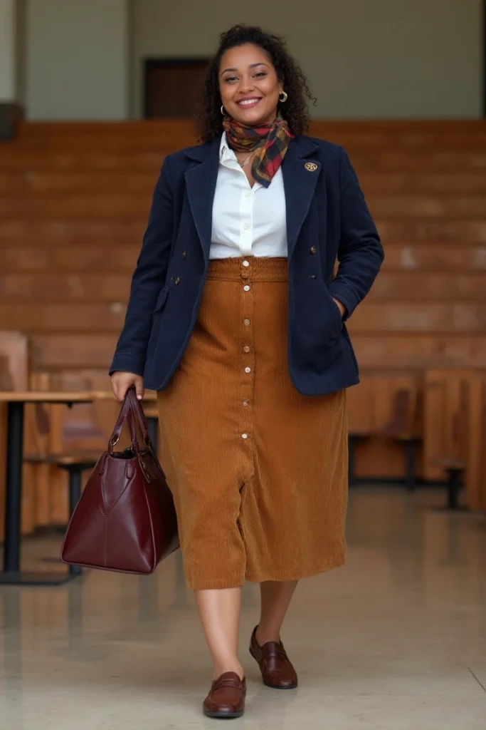 Navy blazer anchors this scholarly ensemble perfectly. Structured shoulders create professional silhouette while maintaining campus-appropriate ease. Corduroy midi skirt brings texture, warmth. Button-front detail adds vintage charm without sacrificing modern appeal.