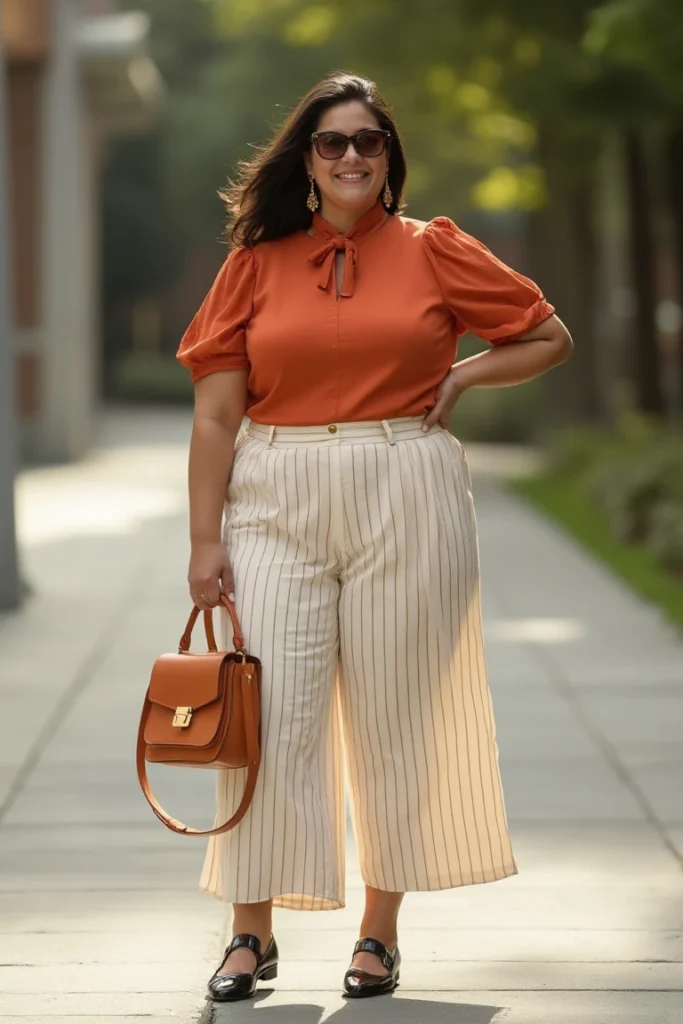 while the crisp, high-waisted culottes bring a breezy balance with their cream base and fine vertical pinstripes, elongating the silhouette. The color story is cohesive and clever: the blouse, bag, and shoes speak to each other without being matchy.