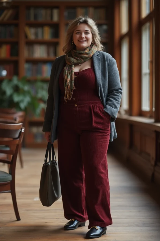 This ensemble is a masterclass in intellectual charm meets everyday comfort. The standout corduroy jumpsuit in deep burgundy brings texture and richness, perfect for fall’s color palette.