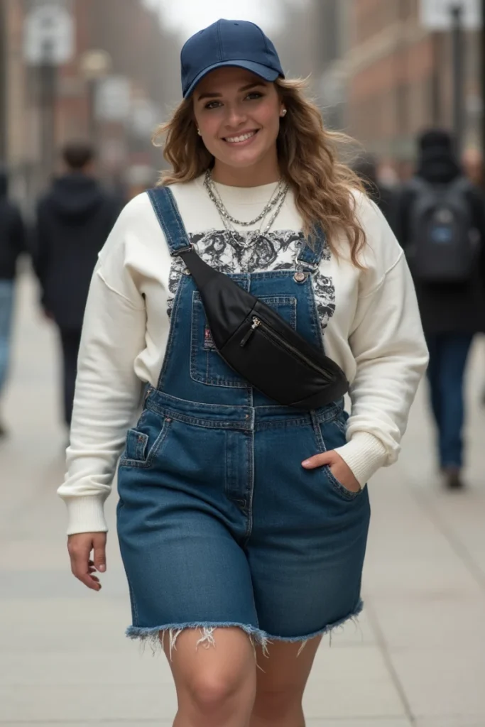 Perfect plus-size campus styling showcased here. Denim overalls create a structured silhouette while a cream sweatshirt adds cozy contrast underneath. Navy baseball cap brings sporty edge to ensemble.