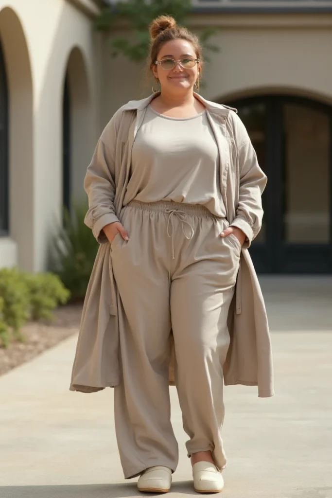 plus-size campus fashion. Beige coordinates create seamless flow from head to toe. Long cardigan adds sophisticated layer while maintaining comfort throughout long study sessions.