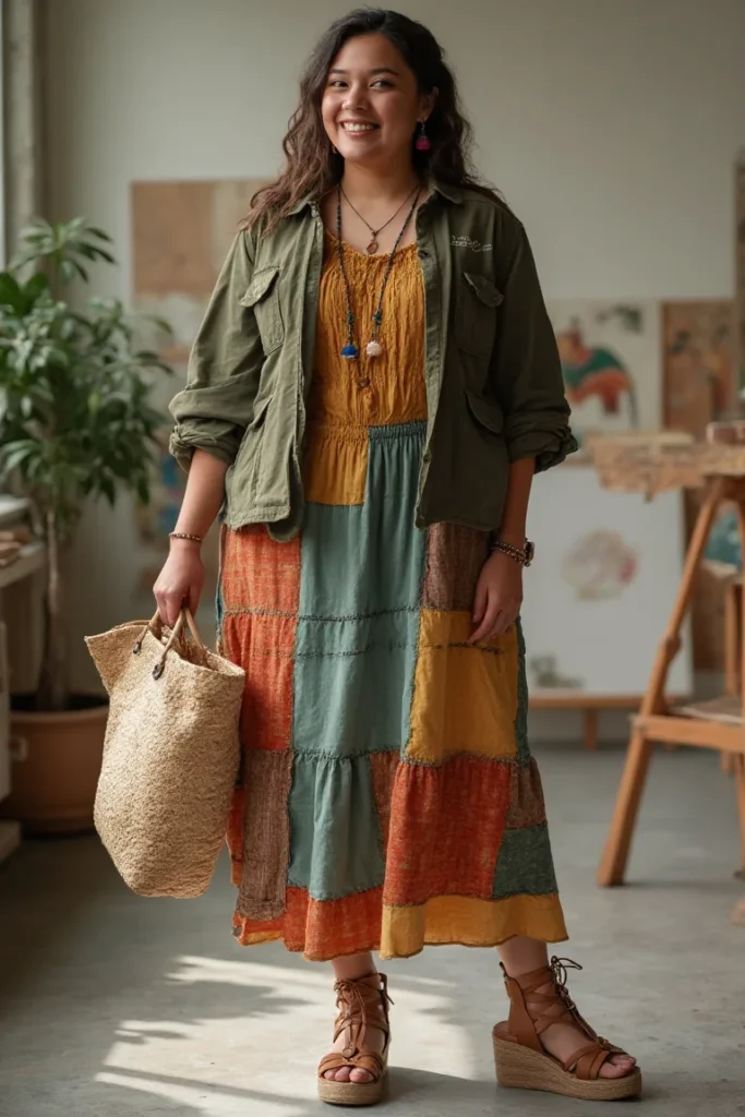 dress showcases earthy color blocking in rust, sage, and mustard tones. Olive utility jacket grounds bohemian aesthetic while adding practical pockets for campus essentials.