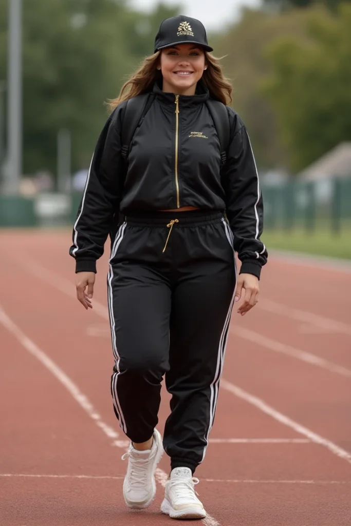 Classic tracksuit styling elevated for plus-size campus wear. Black two-piece set features white side stripes creating elongating vertical lines. Gold zipper details add premium touch to sporty silhouette.