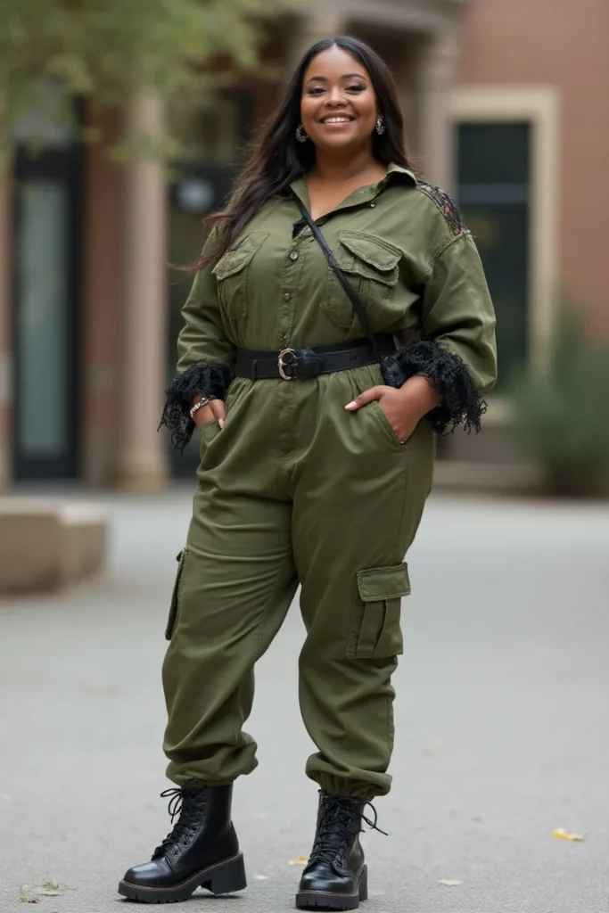 Bold statement dressing for plus-size students who refuse to blend in. Olive utility jumpsuit features functional cargo pockets and structured button-front design. Black leather belt cinches waist, creating defined silhouette while maintaining jumpsuit’s relaxed fit.