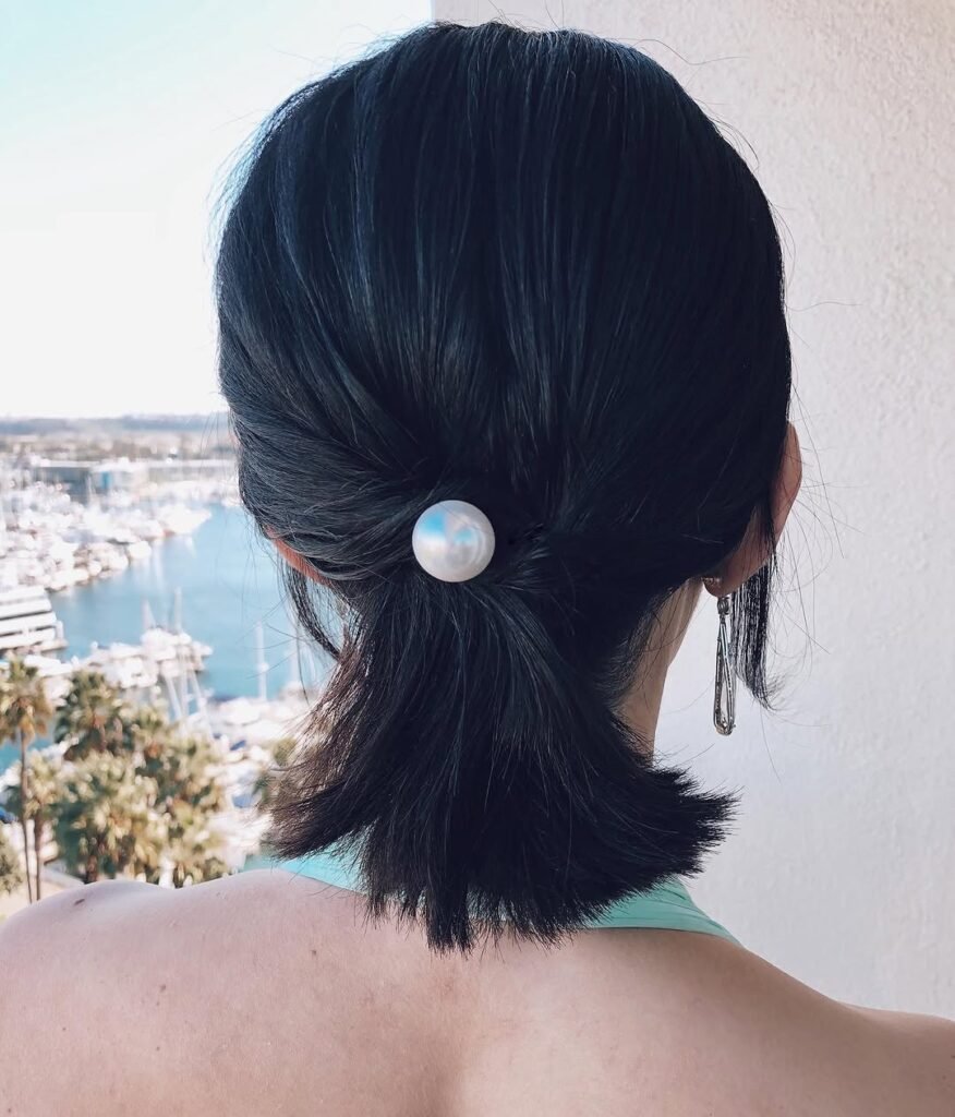 This retro-inspired style is perfect for short hair, which often has fewer updo options than longer lengths. Start by creating small braids on each side of your head and secure them with elastics. Pull the hair back behind your ears, bring the braids toward the back of your head, and pin them in place with bobby pins. Finish by using a rat-tail comb to gently lift the hair above the braids for added volume and a soft, ’60s-inspired look.