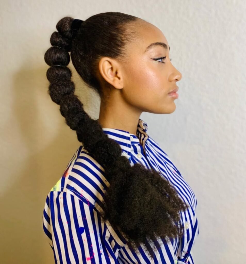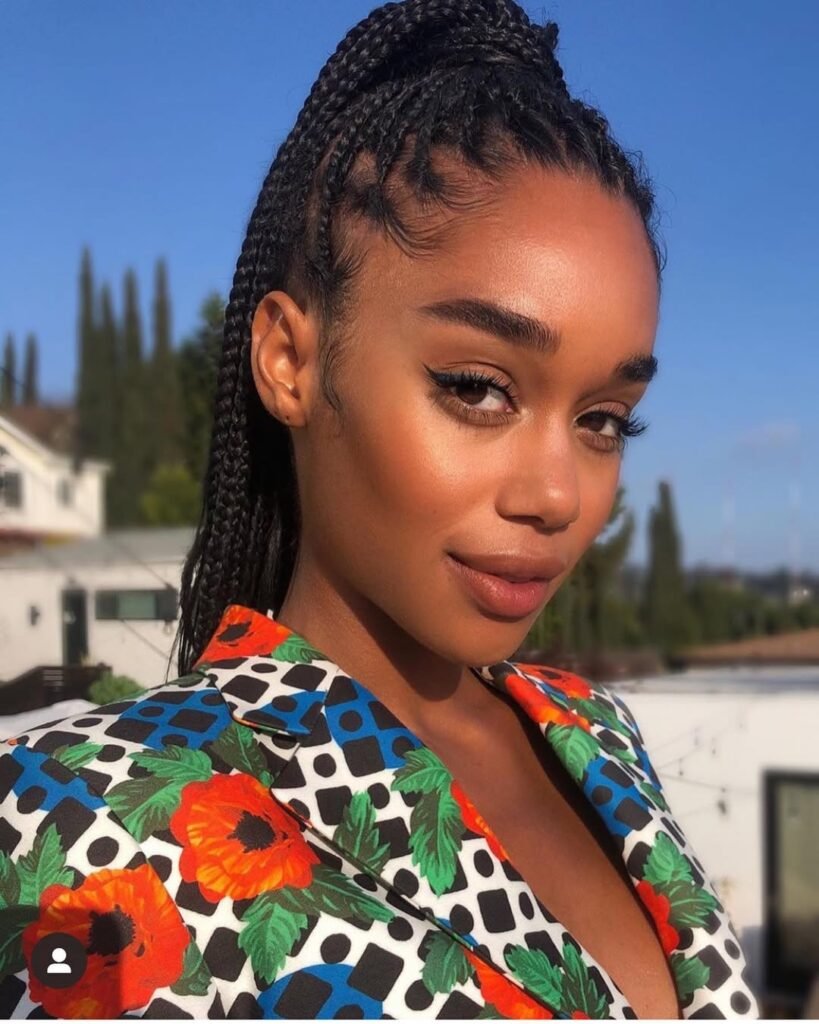 Give your box braids a fresh update by gathering them into a chic braided style. While it looks detailed and stylish, it’s actually a simple look created using your existing braids. Finish by securing the ends with clear or hair-colored elastics so the focus stays on the beautiful braid pattern.
