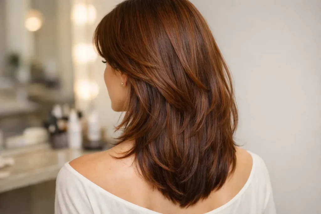 The U shape cut refers to the perimeter line at the bottom of the hair. Rather than a blunt, straight edge across the back, the U shape creates a gentle curve that is longer in the center and shorter at the sides. This shape adds movement, prevents the cut from looking boxy, and elongates the neck beautifully. Combined with long layers cut through the interior, the U shape medium cut delivers a romantic, feminine silhouette that wears equally well worn straight or styled into loose waves. It is one of the most universally flattering medium length options available in 2026.