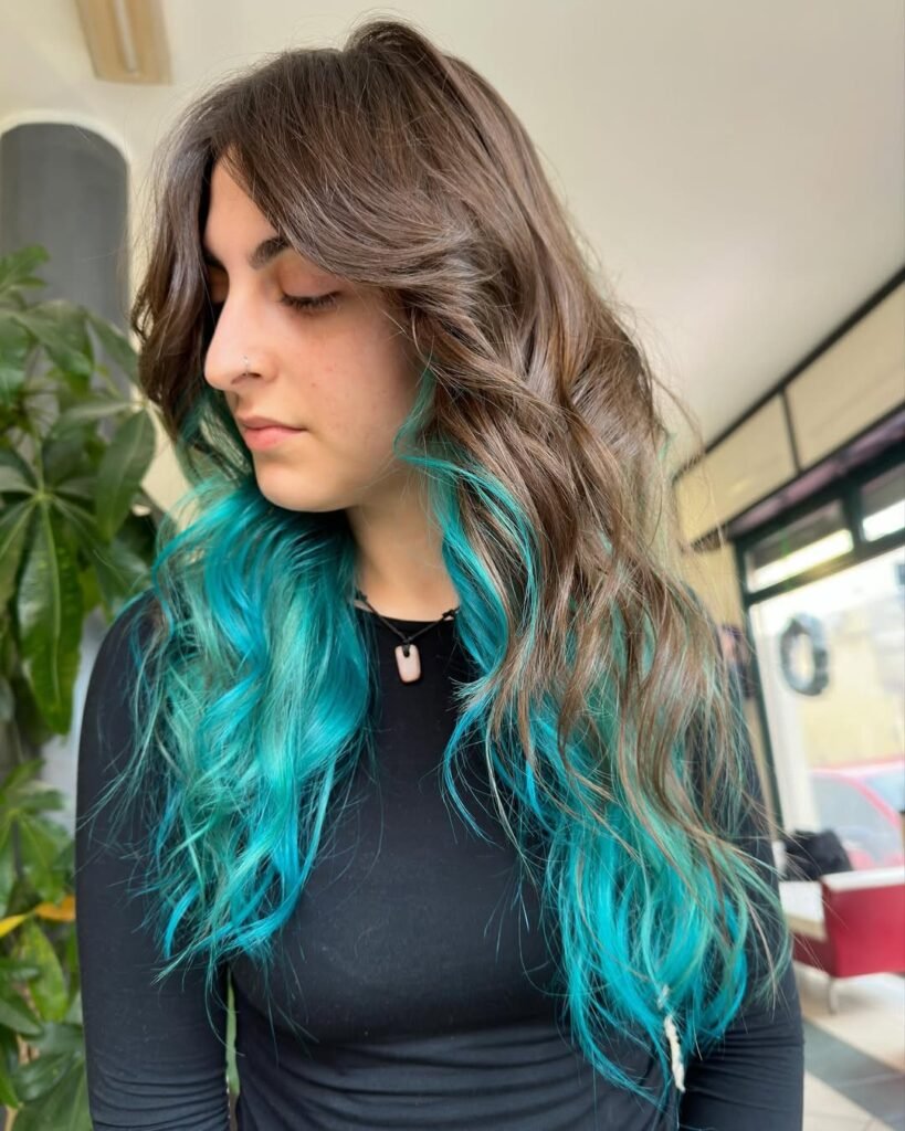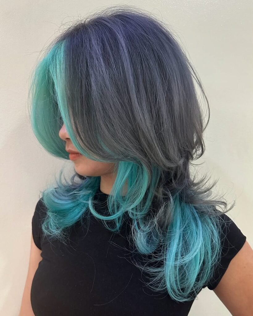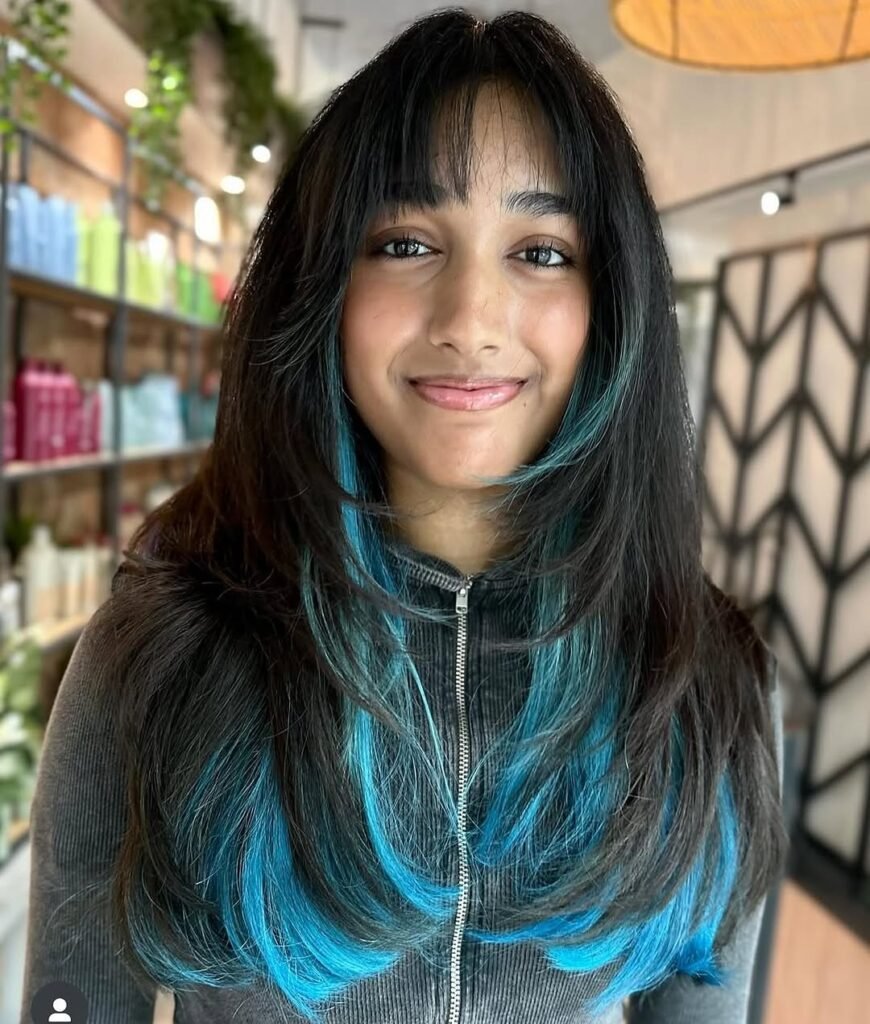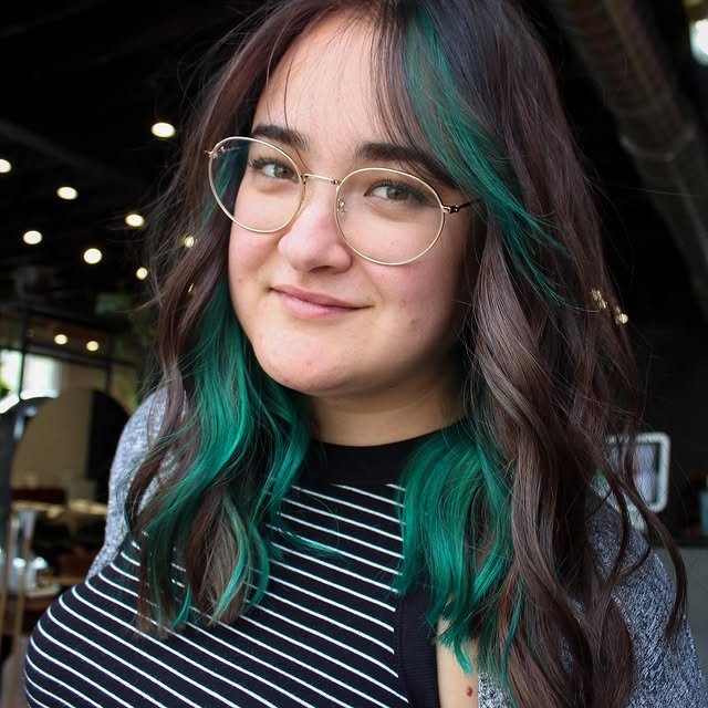 1) Peekaboo Teal Highlights & Wispy Bangs