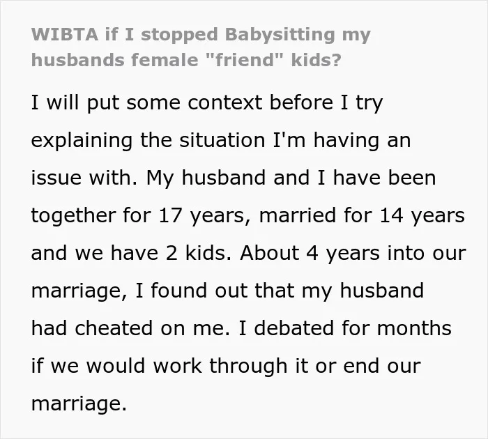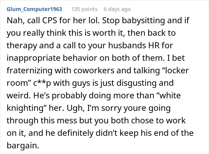Now, instead of focusing on repairing their marriage, he was building a close bond with a female coworker and even asking his wife to babysit this woman’s kids.