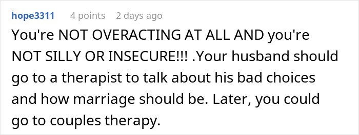 The woman said their therapist advised her husband to stop being friends with another woman because of his history of cheating.