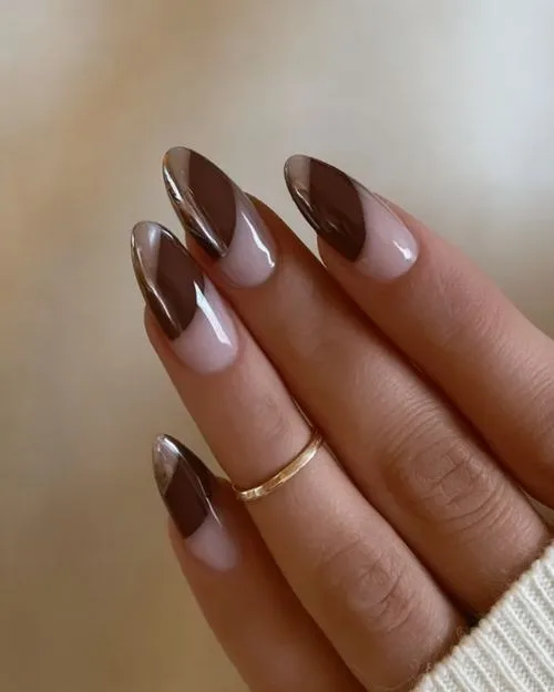 Imagine the French manicure threw out its rulebook and went somewhere a lot cooler. These brown chrome French tips ignore symmetry entirely, going on a little tilt or zigzag. They’re bold but not in-your-face – sort of like reading a serious novel with gummy bears in your lap.