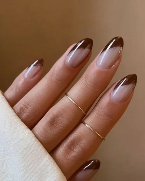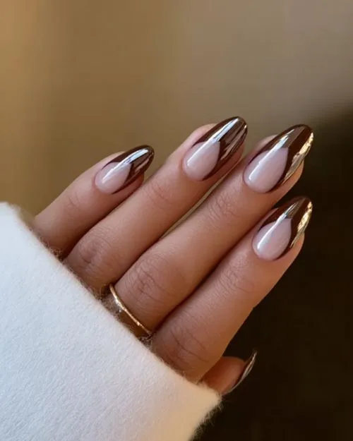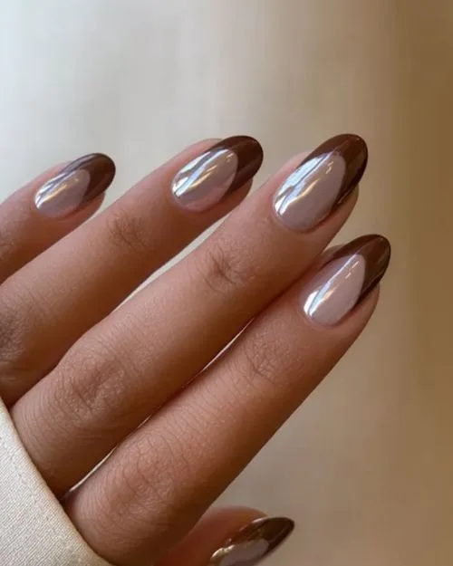Chunky, unapologetic, and very chocolatey. Thick brown French tips with a chrome twist take the classic look and give it a much heavier border – more like “I outlined my nails in fudge.” Best paired with a big coffee and a half-smirk.
