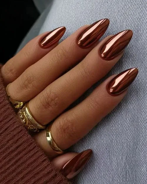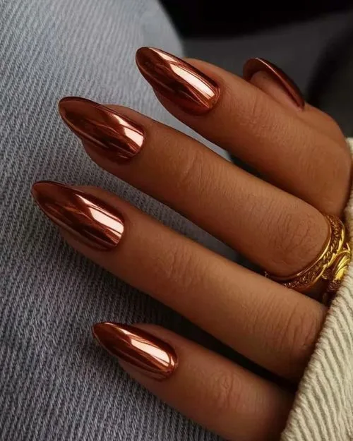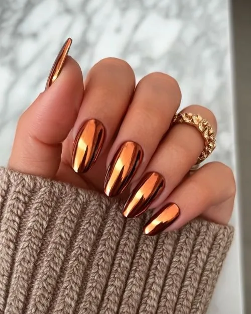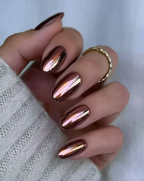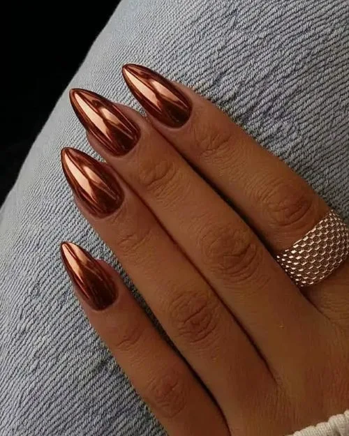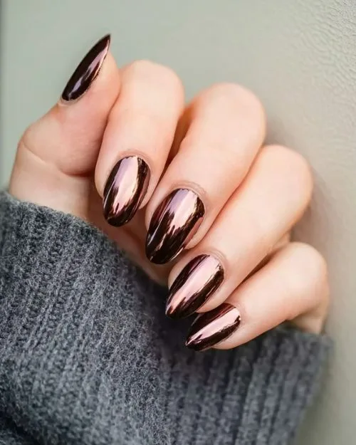 Copper is having a moment, right up there with oversized blazers and viral recipe saves. Chrome amps up the gleam and your hands basically become jewelry. This shade works on short nails, long nails, and literally every skin tone. If dark chrome had its own hardware store, it’d be stocked floor to ceiling in copper.