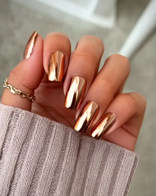 Rose gold chrome nails combine a hint of pink with warm gold, which means they pair with just about anything. Soft but still glossy, they’re perfect for everyday wear or a special occasion. They look fancy but are actually pretty low-effort.