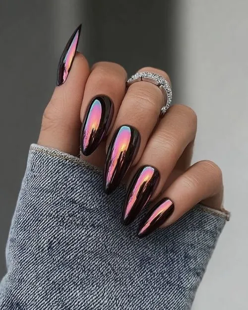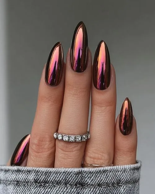 Why settle for one color when you could have several? The skittle nail trend says “choose all the shades” – every nail gets a different deep tone, all finished with a reflective chrome sheen. Plums, browns, forest greens… nothing matches, everything belongs. This one’s for the color commitment-phobes and maximalists.
