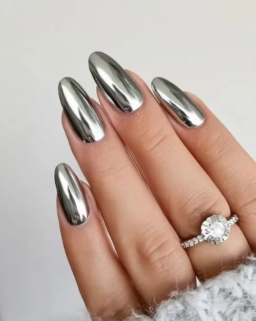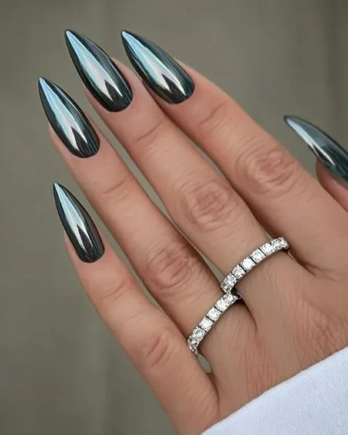Bold as foil, sleek as a new phone upgrade – silver chrome nails are among the shiniest entries in the dark chrome lineup. This shade works equally well as an accent or a full set, carrying serious cool-girl energy all year round. It’s not just for special occasions anymore.