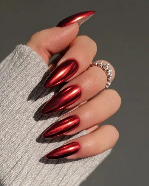Red chrome nails aren’t pretending to be anything other than what they are. They’re flashy, but with a cool, collected edge – think deep crimson, not bubblegum. Bold enough to make a statement, refined enough to feel completely intentional.