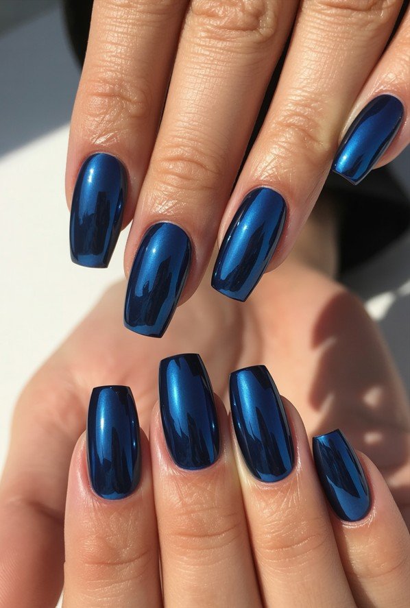 Midnight, ink, deep ocean – blue chrome nails sit right at the intersection of moody and mesmerizing. The reflective finish takes an already striking shade and cranks it up, shifting between navy and electric depending on the light. These are the nails for anyone who wants to be a little unpredictable – cool-toned, quietly dramatic, and impossible to ignore.