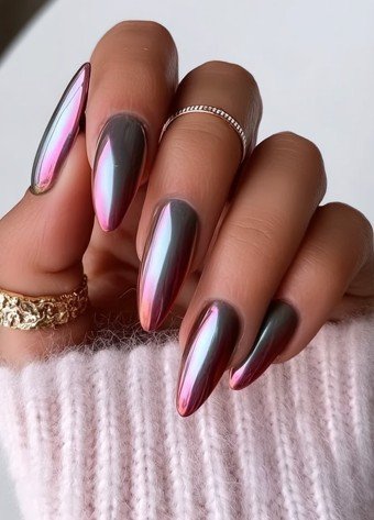 Want nails that look like tiny disco balls? Holographic chrome nails take deep, rich shades and toss in rainbow speckles. The color shift is genuinely surprising – sometimes you’re gold, sometimes pink or blue. Statement-makers, meet your match.