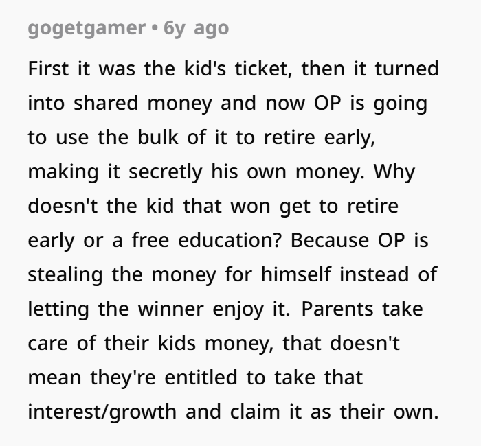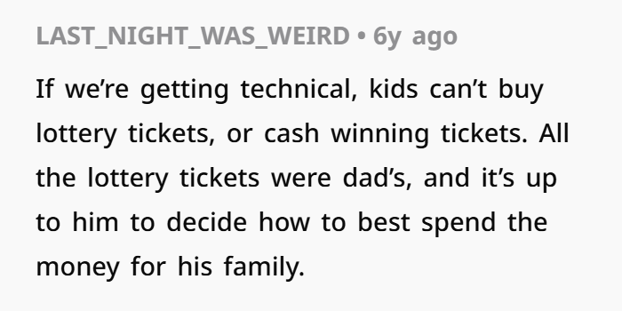 Legally, the father is right his lottery ticket and winnings belonged to him because he bought the ticket and claimed the money. The flip side of this is an ethical one. The ticket was pitched as a family day out, and the family can be forgiven for seeing the winnings as Sam’s prize, or maybe even Sam’s ticket. This suggests that without a mound of unspendable text, the winnings must have been for Sam.