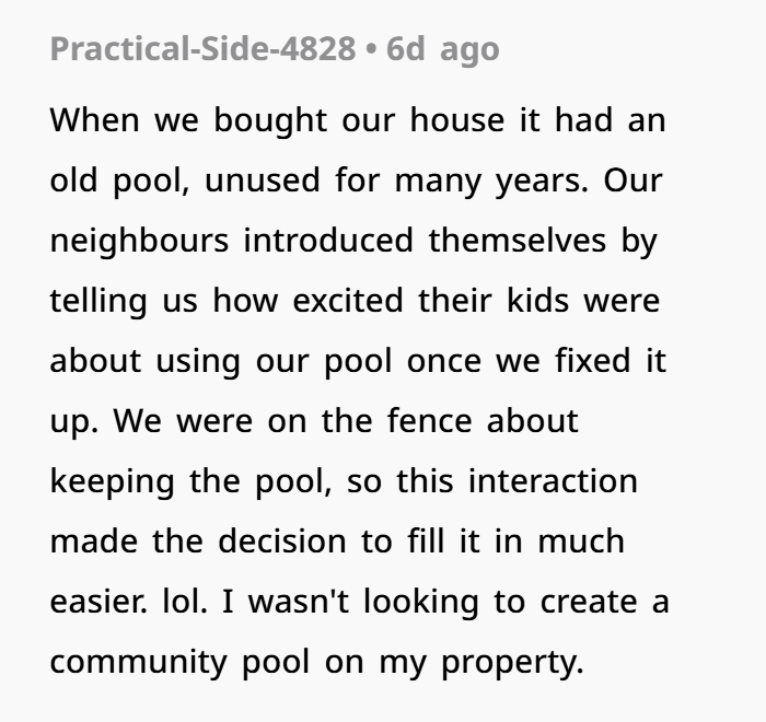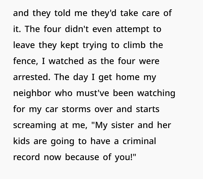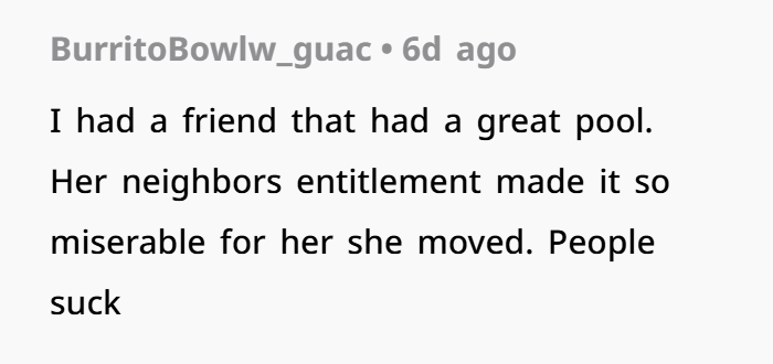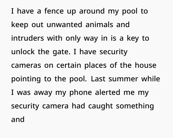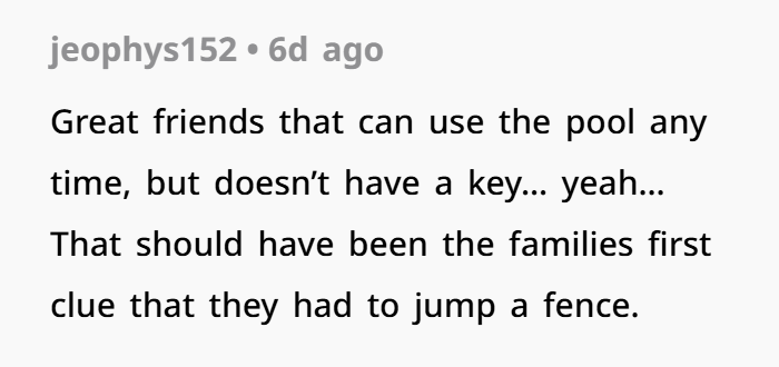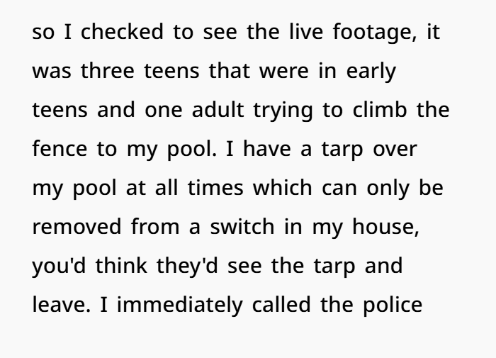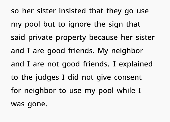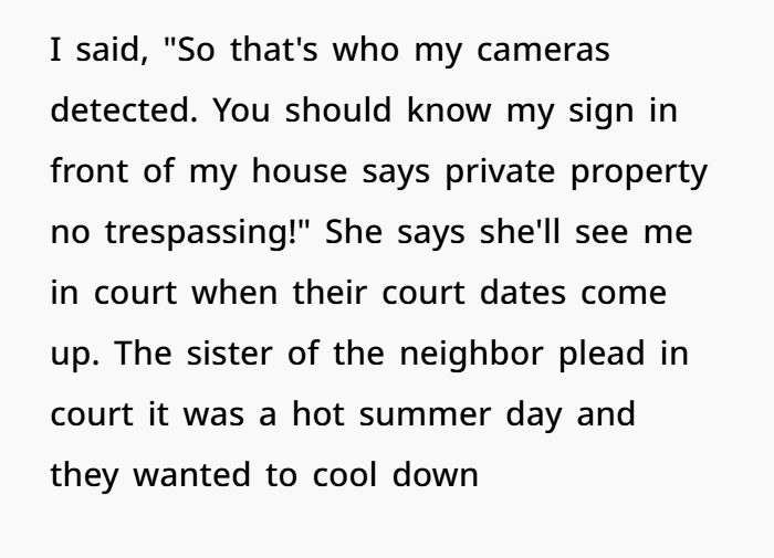 The neighbor’s expectation that her sister and children could access someone else’s pool without consent under the excuse of a hot day speaks to a troubling disregard for autonomy and property rights. Her anger post-arrest highlights a failure to take responsibility, attempting instead to deflect blame onto the very person whose space was violated.