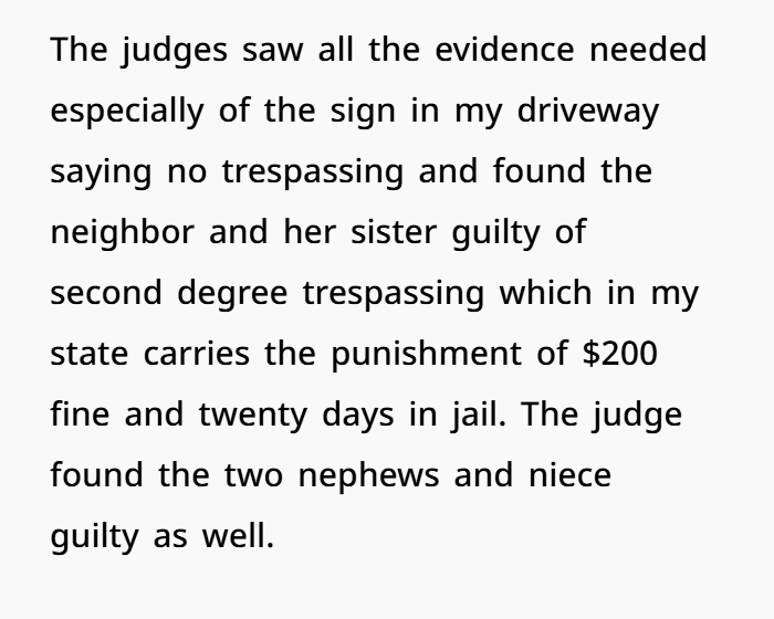 According to statutes in states like North Carolina and Florida, second-degree trespassing can result in a fine of up to several hundred dollars and jail time, typically 20-60 days depending on the judge’s discretion and the circumstances of the case. In this story, the fine and jail time imposed were well within the legal range, and the judge’s decision was supported by irrefutable evidence: surveillance footage and posted warnings.
