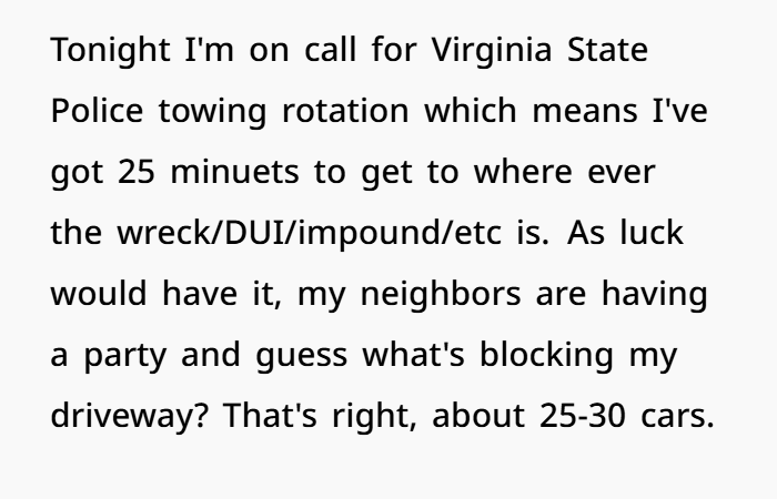 Park anywhere will they get caught eventually seems like a million times, but some people learn the hard way that laws exist for a reason, for example, parking laws nearest to your property is created for a reason especially when you mess with the wrong person. In this instance, a delayed car that was on deck for when the Virginia State Police needed a tow truck driver became annoyed. It was a wild house party at her neighbors, and even though she had clearly told them NOT to block her driveway, by almost 30 cars did.