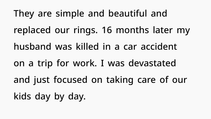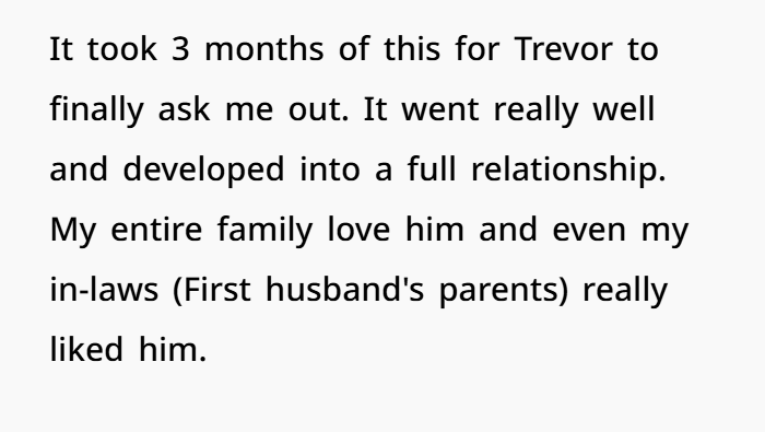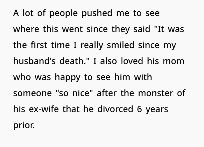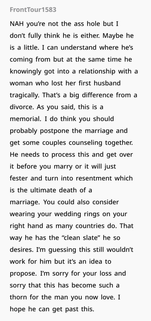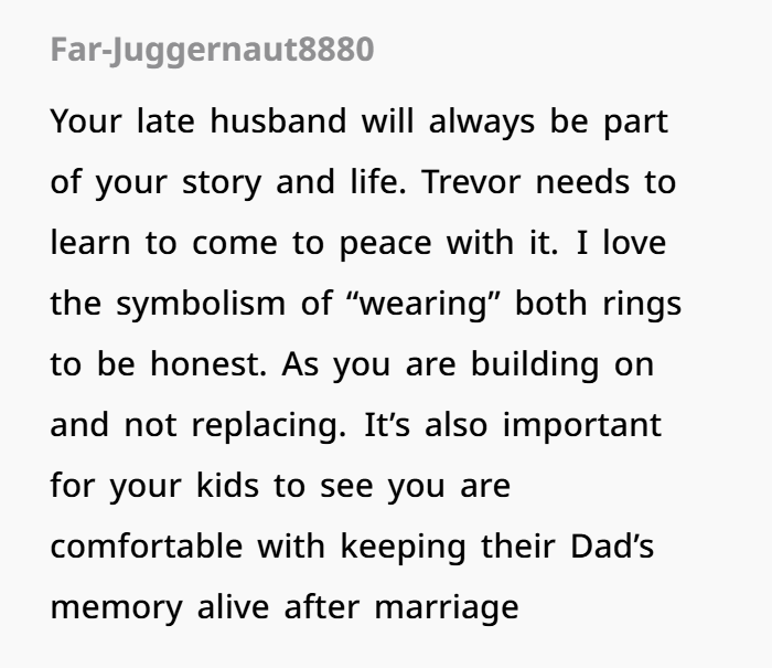 She also adds that the fact the woman didn’t get upset about the gift card shows she truly loves him. “The love she had for her late husband doesn’t mean she loves you any less it just means she’s human. Healing from loss takes time.”
