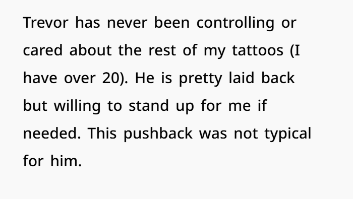 Randall suggests Trevor could show support by getting a meaningful tattoo of his own maybe her nickname for him, the kids’ initials, or something that represents their future together. “This could turn into something beautiful rather than a source of tension.”