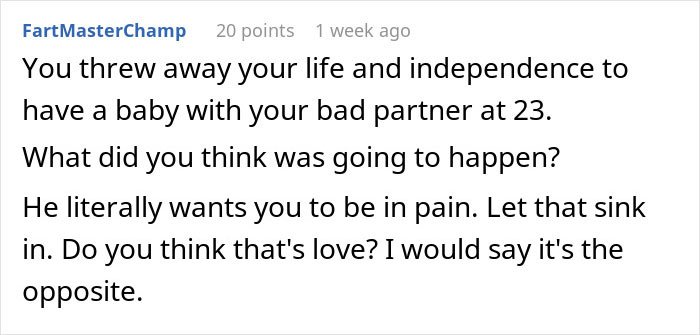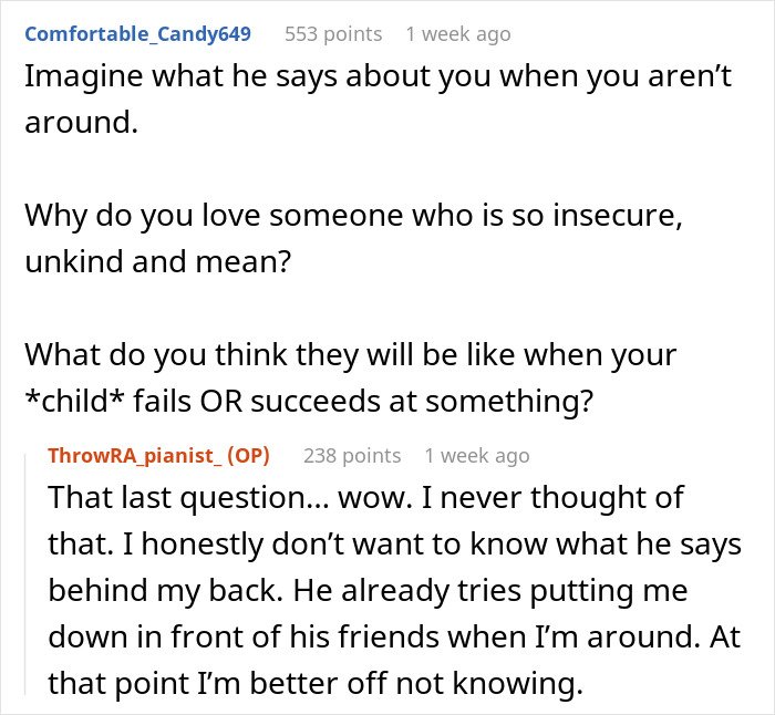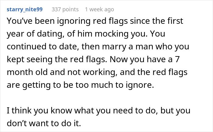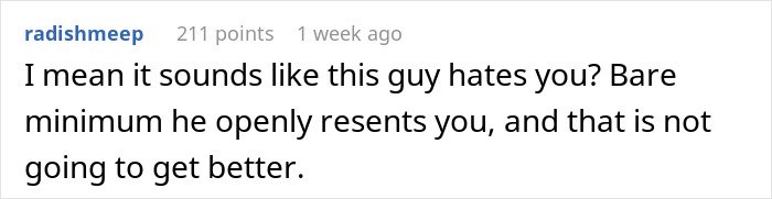 In a healthy relationship, couples should be able to work through their issues. If that’s not the case, the decision to separate might need to be made. But such a choice is the couple’s and only the couple’s to make. Commenters suggested the husband acts this way because he resents or even hates his wife